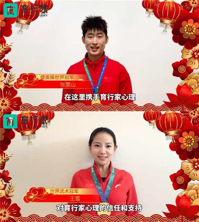 图5.世界武术冠军王雪、健美操世界冠军张景山为育行家录制新年贺词视频截图