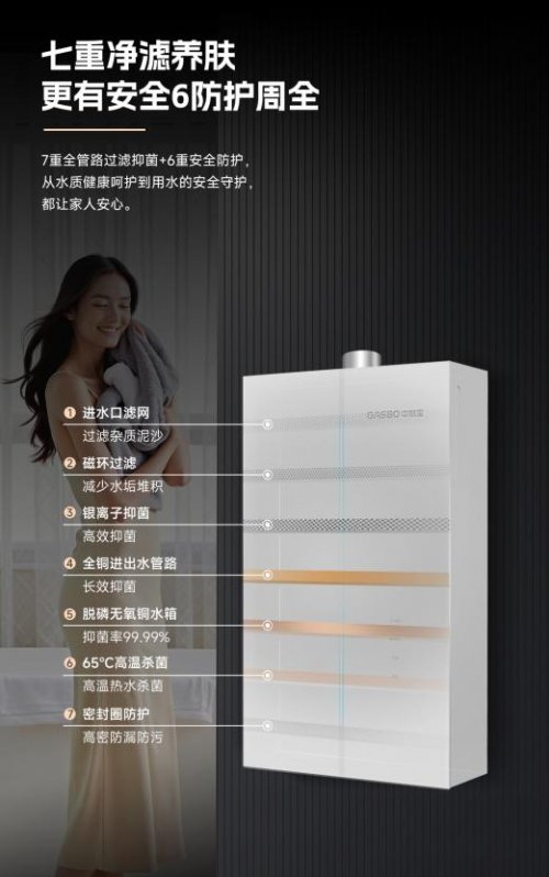 在水质健康层面,中燃宝AI安全型燃气热水器16S7内置7重全管路净化系统,通过进口滤网、磁环过滤杂质,银离子、全铜管路等三重抑菌,搭配高温杀菌技术,全方位隔绝二次污染,出水洁净温和,适配老人、儿童敏感肌肤需求。