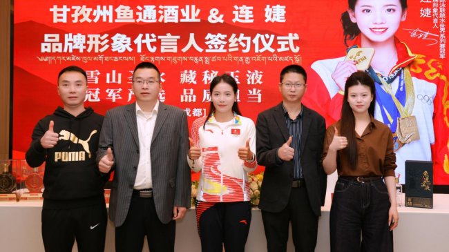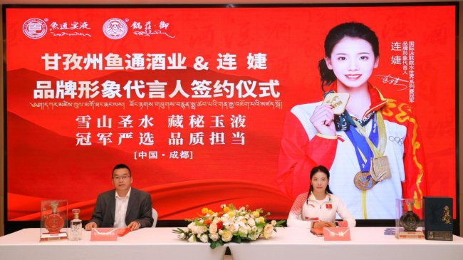 (2026年3月22日,甘孜州鱼通酒业与国际泳联跳水世界系列赛冠军连婕的品牌形象代言人签约仪式在成都隆重举行。双方正式达成战略合作,连婕将以其专业、坚韧的冠军形象,为鱼通酒业代言,共同传递“雪山圣水·藏秘玉液”的品牌理念,助力藏区白酒产业高质量发展。